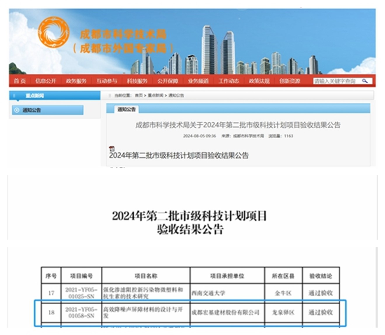 8月5日,成都市科學(xué)技術(shù)局發(fā)布2024年第二批市級(jí)科技計(jì)劃項(xiàng)目驗(yàn)收結(jié)果公告,由成都宏基申報(bào)的《高效降噪聲屏障材料的設(shè)計(jì)與開(kāi)發(fā)》項(xiàng)目,順利通過(guò)驗(yàn)收。